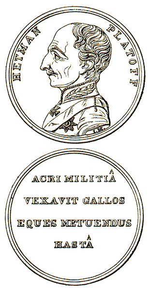 На аверсе одного из таких жетонов *) внутри рубчатого ободка профильное изображение Платова вправо; сверху надпись: HETMAN | GRAF PLATOW.