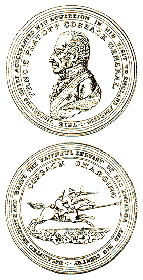 Другой медалью *), чеканенной в Англии в 1814 году, является с грудным изображением Платова влево, в генеральском мундире с лентою через плечо и орденами; сверху надпись: PRINCE PLATOFF COSSACK GENERAL. По окружности медали в линейном ободке круговая надпись: THIS VICTORIOUS CHIEF ACCOMPANIED HIS SOVEREIGN IN HIS VISIT TO ENGLAND JUNE 1814.