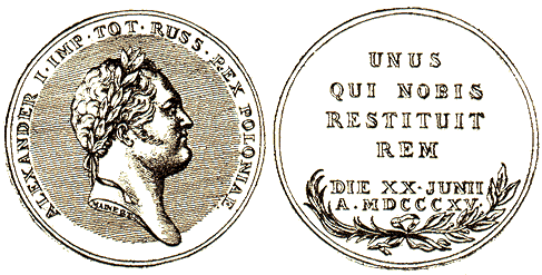 На аверсе погрудное изображение императора Александра I вправо, с лавровым венком на голове. В обрезе шеи фамилия варшавского гравера: MAINERT, а в дуговой надписи над изображением: AREXANDER I IMP, ТОТ. RUSS. REX POLONIA.