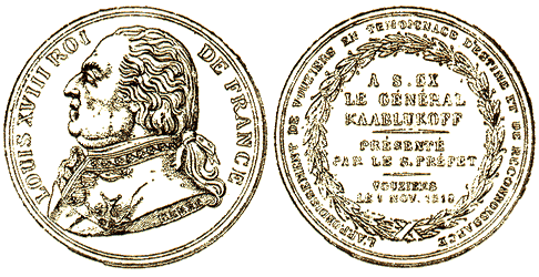 Аверс этой медали во всем схож с предыдущими, а на реверсе внутри венка помещена надпись несколько другого содержания: A U. EX. LE. GENERAL KAABLUKOFF | PRESENTE | PAR LE S. PREFET | VOUSIERS | LE I NOV. 1818.