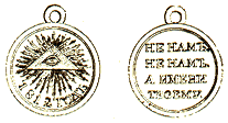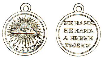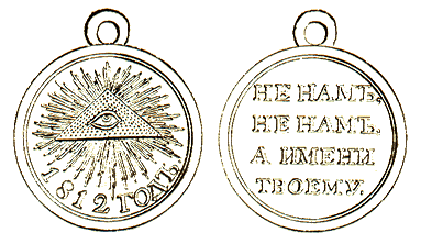 На аверсе этой медали *) лучезарное Всевидящее Око. Внизу надпись: 1812 ГОД.