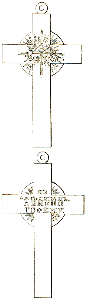 В память войны 1812 года духовенству был роздан для ношения особый крест, на лицевой стороне которого, как видно из рисунка, в средине помещено Всевидящее Око с исходящим от Него сиянием. Ниже в лучах: 1812 год.