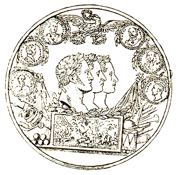 Медальоны эти очень миниатюрны и для рассматривания их необходимо прибегать к помощи лупы. Медаль чеканена из желтой бронзы. Диаметр ее — 54 мм. Место чеканки, а равно гравер — неизвестны.