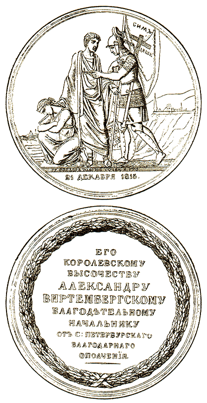 Кроме медали, указанной нами на стр. 21-й, в честь герцога Виртембергского была отчеканена и поднесена ему С.-Петербургским ополчением следующая золотая медаль, на аверсе которой изображен герцог Виртембергский в древнем русском вооружении со знаменем в правой руке; на знамени изображен крест и надпись: СИМ | ПОБЕДИШИ. Левой рукой герцог подает лавровую ветку мужчине, одетому в римскую тогу и держащему в правой руке меч, положенный на плечо коленопреклоненной женщины. За герцогом виден щит с герцогским гербом, а справа на возвышении — город. В двойной линии обреза надпись: ГР. ФЕОДОР ТОЛСТОЙ СОЧИНИЛ И РЕЗ.; под обрезом расположена дата: 21 ДЕКАБРЯ 1813.