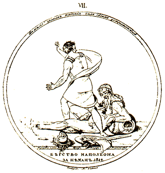 Увенчанный осокою баснословный старец, опершийся на урну, из которой льется вода, представляет реку Немен. Оковы его показывают, что она в cиe время покрыта была льдом. Наполеон едва обернутый в легкое развеваемое ветром одеяние переступает чрез нее. Позади его на берегу реки видны шлем, щит и меч его, в знак совершенной потери всего, что с ним в пределы Российские вступило. Он с ужасом озирается вспять, и при первой надежде спасения своего, как бы от страшного сна пробужденный, едва случившемуся с собою может верить.