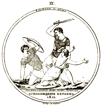 Россиянин подняв меч разит падшего на колено и заслоняющегося щитом своим Француза; гонит его из Берлина, Прусской Столицы, которая, в виде жены, отвращается с ужасом от лютого притеснителя своего, и простирает с радостию руки свои к притекшему на помощь ей Избавителю.