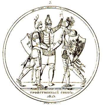 Император Российский Александр Первый сопрягшийся уже дланию дружбы с Королем Прусским Вильгельмом третьим, оба приемлют простертую к ним десницу Австрийского Императора Франца первого. Александр в знак правости дела и чистоты намерений своих воздвигает на небо руку. Тако три Венценосца, сильнейших в Европе, внемля гласу Божию во глас народов своих, заключают во имя Святыя Троицы неразрывный, свыше благословляемый тройственный союз.