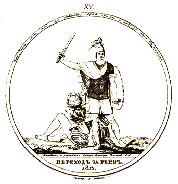 Российский воин с подъятым к небу мечом, призывая в помощь Бога, взирающего на чистоту намерений, переступает твердою ногою с одного берега Рейна на другой. Река сия изображена текущею из урны, обвитой лозою винограда, в знак главнейшего произрастения на берегах оной.