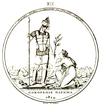 Марта 18 числа союзные войска приближаются к Парижу. Против них под предводительством Мармонта и Мортье выходят немалые силы. Брань возгорается под самыми стенами столицы. Окрестные высоты Монмартра и Бельвиля, защищаемые с упорностию, уступаются наконец силе и храбрости. Вершины и подошвы их устилаются бесчисленными трупами пораженных и рассеянных неприятелей. Российские орудия востекают на крутизны их, и уставя страшные жерла свои прямо на средину града готовы посыпать на него тысячи разрушающих перунов и смертей. Страх и смятение возникли в обиталище роскоши и гордости. На другой день, то есть 19 числа, день вечнопамятный для славы России, смирившаяся и устрашенная столица присылает посольство с ключами и просьбою о пощаде града и жителей. Александр Первый с победоносным воинством своим вступает в оный, проезжает в устройстве и порядке по великолепным его стогнам, сопровождаемый несметным множеством текущих за ним зрителей, кроткими его взорами ободренных и веселящихся. Вскоре вместо плача и рыдания повсюду раздаются радостные вопли и восклицания. Наполеон Бонапарте низвергается с престола. Народ провозглашает на оный законного Короля своего Людовика XVIII. Российские священнослужители посреди града при великом стечении почти всех Европейских Царей, Князей Вельмож, войск и народов, совершают, по обрядам Грекороссийской церкви благодарственное молебствие дарователю побед, всемогущему Богу. Умолкает война. Мир на суше и водах. Великодушие, забывая оскорбления свои, дарует смирившейся вражде пощаду и благоденствие.