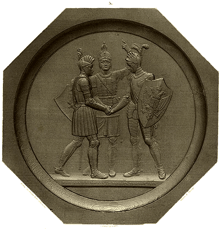 Реверс медали: Три союзных государя: Александр I, Франц I и Фр. Вильгельм III рукопожатиями закрепляют союз; два из них в рыцарском вооружении, третий, стоящий по средине в боевом древнерусском одеянии, указывает левой рукой на небо. Надпись сверху: ТРОЙСТВЕННЫЙ СОЮЗ. Под обрезом: С МЕДАЛЬЕНА ГРАФА ТОЛСТОВА | РЕЗАЛ А. Клепиков 1835 | 1813 | .