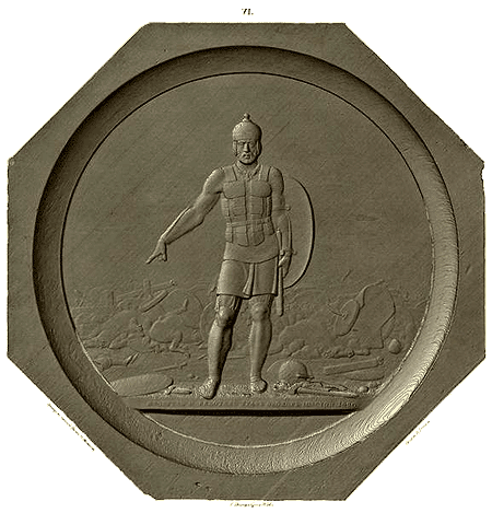 Воин в Славянском шлеме, кольчуге и со щитом на левой руке, которою держит меч; правою указывает на поле битвы, покрытое неприятельскими трупами, убитыми конями, покинутыми колесницами, драгоценными сосудами, щитами, шлемами, обломками копий и Французских орлов.