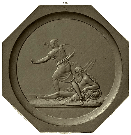 Покрытый звериною кожей дремлющий старец, представляющий реку Неман, сидит на снежном поле, опершись левою рукою на урну, из которой текшая вода замерзла в своем падении; в правой руке держит он весло, на левой ноге видно кольцо с цепью. Наполеон в страхе спешит за Неман; легкая верхняя одежда его развевается ветром. На переднем плане видны брошенные им щит, шлем и меч.