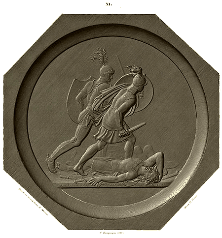 Два воина, один в вооружении Славянском, другой в одежде Германского рыцаря, дружно идут вперед по трупам убитых неприятелей.