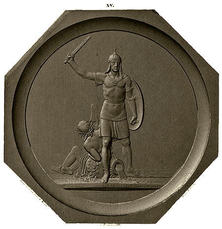 Воин, в Славянском вооружении, с двуглавым орлом на груди, подняв меч, переступает с одного берега Рейна на другой. Река изображена текущею из обвитой виноградною лозою урны, на которую опирается старец, в сидящем положении, увенчанный осокою, с веслом в правой руке.