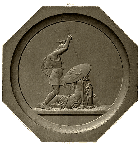 Русский воин копьем ударяет в щит, которым закрывается поверженный неприятель, опираясь правою рукою на землю, где лежат меч и шлем его. На щите изображена женщина, на коленах кормящая дракона из чаши.