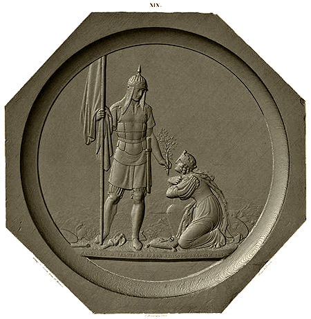 Воин, в Славянском вооружении, держащий в правой руке знамя, подносит масличную ветвь Парижу, в виде украшенной короною женщины, которая пала на колена, сложив руки крестообразно на груди. У ног Русского, на подушке, ключи города, разбитый пополам щит с гербом Французской Империи, изломанный орел и меч. Правая сторона поля покрыта мертвыми телами.