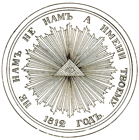 В память этого события была отчеканена медаль, *) на аверсе которой в центре изображено Всевидящее Око, окруженное сиянием, сверху по окружности надпись: НЕ НАМ НЕ НАМ А ИМЕНИ ТВОЕМУ, а внизу: 1812 ГОД.