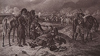 | Битва под Москвой 7 сентября 1812 г. Литография по рисунку А. Адама. 1830-е гг. «Среди многочисленных потерь в этот день мы сожалени также о графе Витгенштейне, полковнике из легкой баварской кавалении. После полудня его настиг выстрел с редута. Спустя несколько часов он умер смертью героя...» А. Адам. |