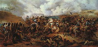 | Французская атака на батарею Раевского и смерть генерала Коленкура 7 сентября 1812 г. Рисунок и литография А. Адама. Середина XIX в. Русские войска мужественно отбивают яростную атаку 2-й кирасирской дивизии Ватье, которую вел генерал Коленкур на штурм батареи Раевского. После ожесточенной схватки французам удалось ворваться на редут. В этом бою генерал Коленкур погиб. |