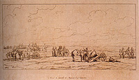 | В окрестностях Бородина 6 сентября Литография по рисунку А. Адама. 1827-1833 гг. Музей-панорама «Бородинская битва». «Накануне сражения войска вице-короля устроили бивуак в небольшом лесу, рядом с Бородином. К полудню они были потревожены многочисленными казаками и чуть было не оказались в руках противника. Зарисовки, выполненные 6 сентября, дают представление о печальном состоянии армии накануне сражения». А. Адам. |