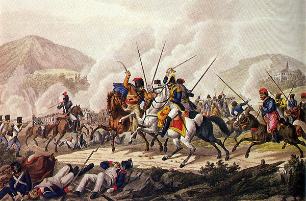 Пленение французского генерала Вандамма при Кульме 30 августа 1813 года. Раскрашенная гравюра К. Г. Раля по оригиналу И. А. Клейна. 1-ая четв. XIX в.