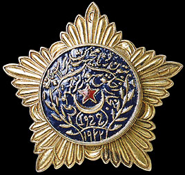 ![]() Знак ордена Красной Звезды Бухарской НСР 1-й степениВ Советской Средней Азии борьба с остатками контрреволюционных сил была особенно тяжелой и продолжительной. За отличия в сражениях с врагами Бухарская Народная Советская Республика награждала своих воинов орденом, который первоначально назывался Знаком Военного отличия, а позднее — орденом Красной Звезды БНСР. Некоторые наиболее отличившиеся воины Бухарской Красной Армии имели по две и даже по три национальные бухарские награды. Помощник военного комиссара 1-го Бухарского кавалерийского имени ЦК Бухарской Компартии полка Ярулла Хасаншин первую свою награду, орден Красной Звезды БНСР 3-й степени, получил за бой под кишлаком Кушхана 2 ноября 1922 года. Следующей награды, ордена 2-й степени, он был удостоен за отличие при уничтожении банды Астан-Корхул-бека 6 февраля 1923 года. Наконец, высшую, 1-ю степень бухарского ордена Я. Хасаншин получил за спасение окруженного басмачами отряда милиции. Столько же наград Бухарской НСР имел и командир эскадрона того же полка М. Ульянов. Советская Россия на помощь молодым и не имеющим опыта национальным частям Красной Армии прислала лучшие свои силы, закаленные на фронтах гражданской войны. Многие русские красноармейцы и командиры с гордостью носили бухарские награды, которыми была отмечена их помощь в борьбе с басмачеством в Средней Азии. Командир корпуса П. А. Павлов за отличия в борьбе с басмачеством был награжден орденом Красной Звезды БНСР 1-й степени. В 1923 году после нескольких удачно проведенных новых операций против басмачей IV Всебухарский Курултай (съезд) отметил заслуги П.А. Павлова небывалой дотоле наградой — холодным оружием с прикрепленным к нему знаком бухарского ордена. В Грамоте ЦИК Бухарской НСР, преподнесенной П. А. Павлову вместе с наградой, говорилось: „Благодарный бухарский народ в лице своего выборного органа четвертого Всебухарского Курултая постановил присудить Вам для ношения почетную серебряную шашку с орденом Военного Отличия 1-й степени на эфесе. Означенное отличие присуждается Вам, глубокоуважаемый товарищ Павлов, за Ваши победы над врагами бухарского народа". Текст Грамоты был повторен на клинке. Ножны шашки были украшены пятью миниатюрными золотыми знаками ордена.