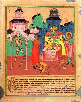 Яворский Стефан (1658-1722), видный церковный деятель, полемист, автор проповедей и панегириков. Картинка является иллюстарцией к стихотворению, главная мысль которого в необходимости помнить о кратковременности жизни и стараться жить, избегая суеты. Здесь изображен человек у стола, на котором лежат песочные часы (быстротечность времени), книга и чернильница с гусиным пером (мудрость жизни). На столе лежат мешок с деньгами, корона и цветок. Они, вероятно, символизируют ту суетность и мирские радости, которых человеку следует избегать