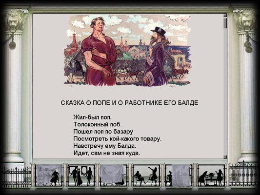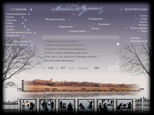 Весь материал диска представлен в виде энциклопедии и летописи. Мультимедиа-энциклопедия, объемом около 10 тысяч статей, до 1000 иллюстраций и 100 звуковых и видеофрагментов, имеет развитую поисковую систему и многоуровневый тематический рубрикатор. Состоит из трех разделов: «Пушкин», «Произведения» и «Интерпретации». Летопись представлена шкалой времени, наглядно отражающей хронику жизни и творчества поэта, жизни его произведений в искусстве России. Предусмотрены быстрый поиск запрошенного материала, возможность распечатки текстов, иллюстраций, карт, переноса интересных материалов с диска в собственный документ пользователя, получения дополнительных материалов и текущей информации с помощью сети INTERNET.