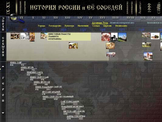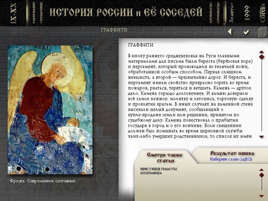 «История России и ее ближайших соседей» основана на трехтомной энциклопедии «История России» издательского центра «Аванта+», значительно переработанной и дополненной не вошедшими в книжный вариант материалами. В составе диска: статьи (свыше 3-х томов текста); сравнительная хронология исторических событий; подробные биографии замечательных русских историков; рассказ о вспомогательных исторических дисциплинах: нумизматике, геральдике, сфрагистике, эпиграфике, бонистике, фалеристике, генеалогии, археологии; указатели: биографический (3,5 тыс. персоналий), географический (более 2 тыс. объектов), топографический (около 1 тыс. объектов), исторических событий (более 1 тыс. событий), терминологический словарь (более 1 тыс. терминов); алфавитный и систематический рубрикаторы, тематический (по темам школьной программы 5-11 классов); 2,5 тысячи иллюстраций – рисунков, фотографий, картин, музейных экспонатов; 68 карт войн и сражений (из них 20 – анимированных); 52 сюжета, смонтированных из фрагментов уникальной кинохроники, включая редкие изображения Махно, Корнилова, Дзержинского и других исторических деятелей. 11 часов озвученных текстов исторических документов и художественных произведений, фрагментов из трудов выдающихся ученых.