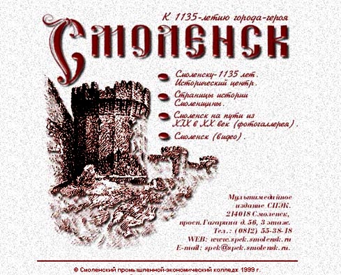 Мультимедийное издание об истории и культуре Смоленска, его прошлом и настоящем. Смоленск - один из древнейших русских городов. Первое упоминание о нем в Устюжском летописном своде относится к 863 году. В то время город был крупным пунктом торговли и ремесленного производства.