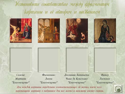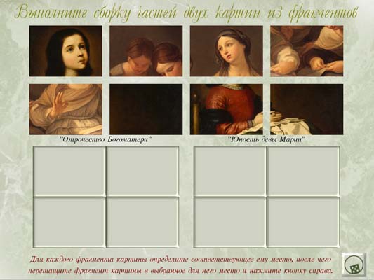 Образовательный курс “Евангельские сюжеты в западноевропейской живописи из коллекции Государственного Эрмитажа” состоит из пяти частей: “Главные образы Нового Завета”, “История Марии”, “Детство Христа”, “Служение Христа”, “Страдания Христа”. Пользователи получают возможность познакомиться с основными событиями Евангельской истории, которая на протяжении длительного времени являлась источником тем для западноевропейской живописи. Программа рассказывает об иконографии, символике и развитии их разными художественными школами Западной Европы в период с 15 по 18 век. Благодаря современным компьютерным технологиям пользователь получает возможность увидеть детали картин, которые не всегда можно рассмотреть на экспозициях. Курс рассчитан на старшеклассников, но представляет интерес для всех тех, кто интересуется проблемами изобразительного искусства от младших школьников до преподавателей школ и вузов. Программа установлена в образовательном Центре Государственного Эрмитажа.