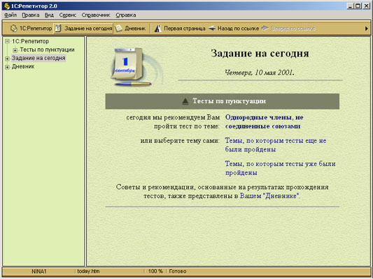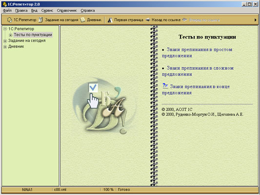 «1C:Репетитор. Тесты по пунктуации» - оригинальная , специально разработанная система компьютерных тестов, позволяющая проконтролировать уровень владения пунктуацией по теме, а также выявить в ходе тестирования причины ошибок и получить обоснованную индивидуальную рекомендацию, которая поможет избежать ошибок в дальнейшем. Тесты адресованы школьникам старших классов, абитуриентам, студентам, учителям-русистам, а также всем, кому по роду своих занятий необходимо писать грамотно или проверять грамотность других.