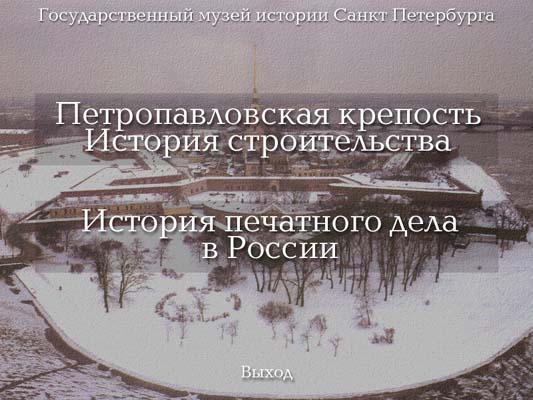 Виртуальные экскурсии музея истории Санкт-Петербурга. Мультимедийная программа «История строительства Петропавловской крепости» предоставляет уникальную возможность «увидеть» все этапы создания этого интереснейшего фортификационного сооружения и проследить историю формирования архитектурного комплекса. Экскурсия «История печатного дела в России» рассказывает о зарождении и развитии книгопечатания в Западной Европе и России; экономит со старинными техниками печати: ксилографией, офортом, литографией и линогравюрой. В программах использованы репродукции художественных произведений XVIII-XX вв. и видеофрагменты. Анимационный видеоряд сопровождается дикторским текстом, музыкальным оформлением и звуковыми эффектами. Экскурсии предназначены для интересующихся российской историей, могут быть использованы на уроках в школе.
