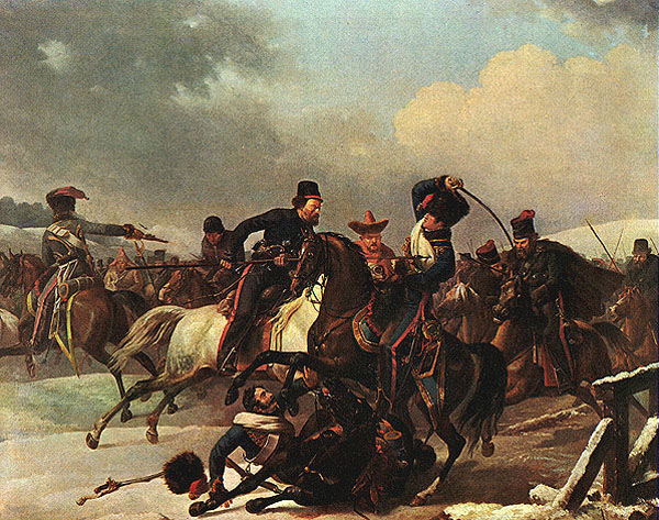 На картине показана схватка казаков с отступающими французами. Вместе с казаками в ней участвуют башкиры, калмыки, татары. Ближе к зрителю лежит на снегу сбитый французкий офицер.