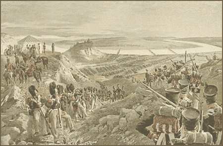 В 6 часов утра Наполеон выехал из своей квартиры, окруженный блестящим штабом, состоящим из маршалов, генералов и других сановников; золото и серебро, казалось капало с них. Каждый маршал был иначе одет и каждый из них богаче другого. Из всех выдавался мундир неаполитанского короля Мюрата, похожий на гусарский, осыпанный дорогими камнями; на голове была шляпа a la Henri IV, у которой было много драгоценных разноцветных перьев, пришпиленных бриллиантовой кокардой. Только Наполеон один отличался простотою своего костюма: на нем был мундир французской гвардии, синего цвета, с лентой и звездой почетного легиона. Зато его лошадь отличалась от всех: белая как молоко, сбруя, украшенная дорогими камнями, а попона из тонкого багрового сукна, обсыпанная золотыми орлами, доходила до земли. Как только вся эта знать остановилась перед гвардией, грянуло «vive l’empereur» и войско сделало на караул. Затем маршал Бертье прочел объявление войны России и приказ о вторжении в ее пределы. Снова войско сделало на караул, грянуло снова «vive l’empereur» и раздался генерал-марш. Вслед затем Наполеон со свитой останавливался перед каждой из следующих трех линий, и повторялась та же самая церемония. Как только император возвратился в город, в армии началось большое движение, т. к. все отряды стали готовиться к походу. Во главе авангарда был король Мюрат. Авангард состоял из нескольких кавалерийских полков, и именно: во главе шел уланский полк гвардии Красинского, за ним следовали: 8-й уланский полк князя Радзивилла, 6-й полк Понговского, гусарские красные голландские и черные прусские полки с изображением мертвой головы.