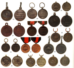 Уменьшенный вариант серебряной медали (№24), хотя почти и соответствует по размеру официальному штемпелю (24 мм. вместо 23,8 мм.), не мог быть заказан на монетном дворе частным образом со штемпеля бронзовой медали, поскольку нижняя строка в надписи короче остальных трех, да и форма треугольника со всевидящим оком отличается от утвержденной.