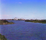 Продолжение предыдущей фотографии вправо. Справа на холме - Горицкий монастырь. На фотографии видна колокольня монастыря (XVIII в.), которую Прокудин-Горский не сфотографировал отдельно крупным планом.