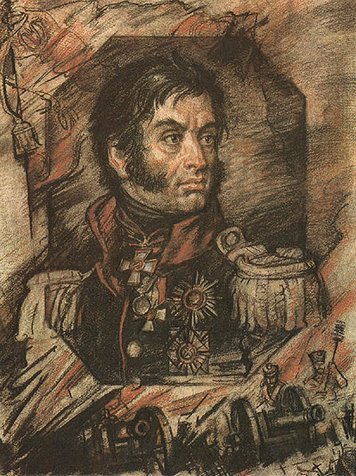 На Бородинском поле Раевский стоял в центре русских позиций. Знаменитая батарея Раевского вошла в историю символом стойкости и жертвенного героизма. «Редутом смерти» называли ее французы. «В опасности он истинный герой, – писал К.Н.Батюшков, – он прелестен, глаза его разгораются, как угли, и благородная осанка его поистине делается величественною».