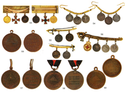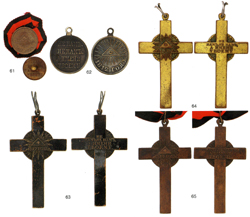 Кстати, изображенная на стр.113 под №44 позолоченная медаль, не является не только наградной медалью, но даже и «фрачным знаком», поскольку золото для подобных медалей не было предусмотрено вообще и нельзя сказать, какую награду этот знак олицетворяет. Подобные знаки относятся к категории фантазийных самодельных знаков (о чем обязательно необходимо указывать при их публикации). Те же рассуждения в полной мере относятся и к золоченому наперсному кресту, приведенному на стр.115 (№64).