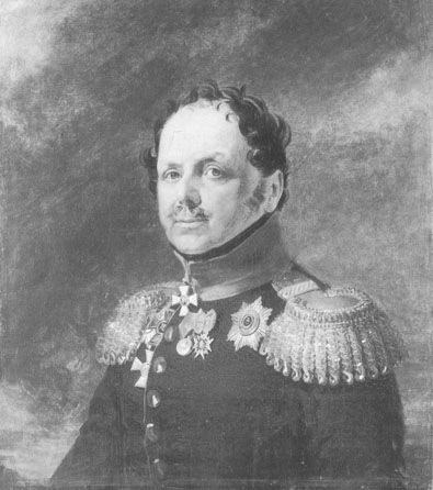 Изображен в общегенеральском кавалерийском вицмундире образца 1814 г. На правой стороне груди звезда ордена Св.Анны 1-й ст., а на левой – серебряная медаль участника Отечественной войны 1812 г., крест сицилийского ордена Св.Януария и звезда ордена Св.Владимира 2-й ст., на шее крест ордена Св.Георгия 3-го кл., из-под борта выступают кресты ордена Св.Владимира 2-й ст. и прусского ордена Красного Орла 2-й ст.