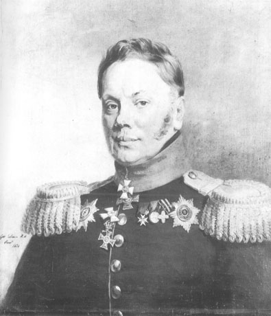 Изображен в общегенеральском кавалерийском вицмундире образца 1814 г. На правой стороне груди звезда ордена Св.Анны 1-й ст., а на левой – крест ордена Св.Иоанна Иерусалимского, серебряная медаль участника Отечественной войны 1812 г., золотой крест за взятие Праги и звезда ордена Св.Владимира 2-й ст. На шее кресты орденов Св.Георгия 3-го кл. и Св.Владимира 2-й ст., из-под борта выступают кресты прусского ордена Красного Орла 2-й ст. и австрийского ордена Леопольда 2-й ст.