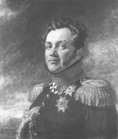 Изображен в общегенеральском вицмундире образца 1817 г. с атрибутами генерал-адъютанта (вензеля императора Александра I на эполетах и аксельбант). На левой стороне груди серебряная медаль участника Отечественной войны 1812 г., крест французского ордена Св.Людовика, звезды прусского ордена Черного Орла и ордена Св.Владимира 1-й ст. На шее крест ордена Св.Георгия 3-го кл.