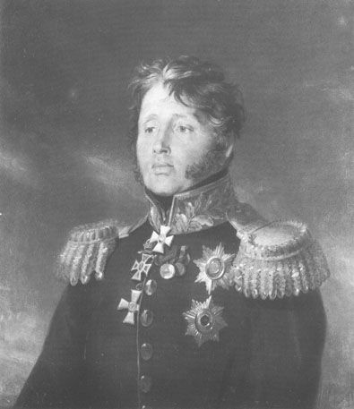 Изображен в общегенеральском мундире образца 1817 г. На левой стороне груди серебряная медаль участника Отечественной войны 1812 г., бронзовая дворянская медаль в память Отечественной войны 1812 г., звезды орденов Св.Александра Невского и Св.Владимира 1-й ст. На шее кресты ордена Св.Георгия 3-го кл. и австрийского ордена Леопольда 2-й ст., из-под борта выступает крест прусского ордена Красного Орла 2-й ст.