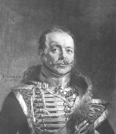 Изображен в генеральском доломане Ольвиопольского гусарского полка с ментиком на левом плече. На левой стороне груди золотой крест за взятие Очакова (ошибочно изображенный вместо золотого креста за взятие Измаила), серебряная медаль участника Отечественной войны 1812 г. и бронзовая дворянская медаль в память Отечественной войны 1812 г. На шее кресты ордена Св.Владимира 3-й ст., прусского ордена Красного Орла 2-й ст. и ордена Св.Анны 2-й ст.
