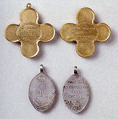 Золотой офицерский крест и серебряная солдатская медаль за взятие штурмом крепости Очаков в декабре 1788 г. Лицевая и оборотная стороны