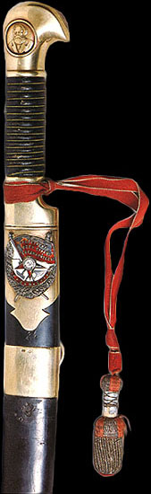 Декретом ВЦИК от 8 апреля 1920 года было введено Почетное революционное оружие — шашка с вызолоченным эфесом и с положенным на эфес знаком ордена Красного Знамени. Первым пунктом в декрете было записано: „Почетное революционное оружие как награда исключительная присуждается за особые боевые отличия, оказанные высшими начальствующими лицами в действующей армии". Всего этой награды был удостоен 21 выдающийся советский военачальник. Среди них Главнокомандующий всеми вооруженными силами Республики С. С. Каменев, легендарные герои гражданской войны М. В. Фрунзе, С. М. Буденный, К. Е. Ворошилов, Г.И. Котовский, талантливые красные полководцы М. Н. Тухачевский, С. К. Тимошенко, И. П. Уборевич, А.И. Корк и другие.