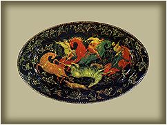 едор Александрович Каурцев (1896 - 1963) свободно владел техникой иконописи и стенописи. В его миниатюрах ощущается влияние современного искусства и народного лубка. Шкатулка "Увидели аэроплан" (1931). Композиции по произведениям Гоголя "Бал у губернатора" из "Мертвых душ".