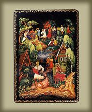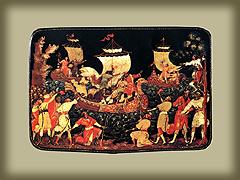 злюбленными песнями палешан были всегда песни о Волге, о Степане Разине. Здесь важен не просто сюжет, но творческое проникновение в музыкальный образ русской песни. Ритмическая структура песни и традиционные принципы древнерусской живописи определили особенности пластических средств палехского искусства. Условно - орнаментальную трактовку образа позднее сменяет сложная разработка песенного сюжета. Например, в миниатюрах А.Ватагина - "Есть на Волге утес", А.Дыдыкина - "Волга - русская река", И.Баканова - "Песня о Степане Разине". Средствами декоративной живописи в образах миниатюр выражены волжское раздолье, широкая мелодия русских песен.