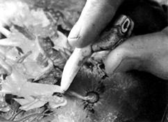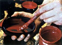 осле живописи - лакировка, просушка. Затем поверхность изделия вновь пемзуется и выполняется роспись твореным золотом. Листовое сусальное золото растирают гуммиарабиком до получения однородной массы. В массу наливают воду, через некоторое время золото оседает, а гуммиарабик растворяется в воде. Воду осторожно сливают, а слой золота просушивают.
