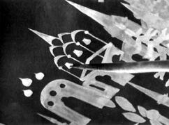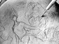 ледующий этап - раскрытие иконы в цвете, сначала плотными корпусными красками локальных тонов, затем тонкими прозрачными лессировками, называемыми в иконописи "плавями". Плави, каждая светлее предыдущей, придают объемность изображению. Характеристика объема довершается наложением пробелов или разбельных цветов, соответствующих локальному тону или твореным золотом. Последний момент пробелки - оживка чистыми белилами, обозначающими самые яркие блики света на объемных формах. В моделировании ликов художники Палеха используют не только плави, но и отборку. Отборка - перекрестная штриховка в тенях и светах, разными тонами, в зависимости от цвета плавей.